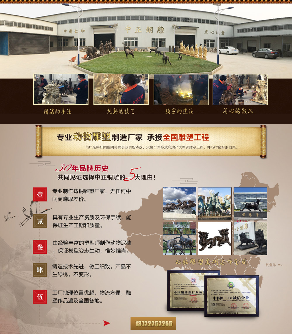 河北中正鑄銅工藝品制造有限公司是一家專業制作鑄銅動物雕塑的生產廠家。擁有完善、大型、先進的鑄造生產設備,并由數位經驗豐富的高級鑄造技師指導生產及制作。我們公司主要鑄造動物銅雕、銅獅子、銅麒麟、銅牛、銅馬、銅鹿、銅大象等,可按客戶提供動物銅雕圖片訂做、加工動物銅雕,動物銅雕塑,我們的產品做工精美,造型生動,用銅扎實,質量有保證。